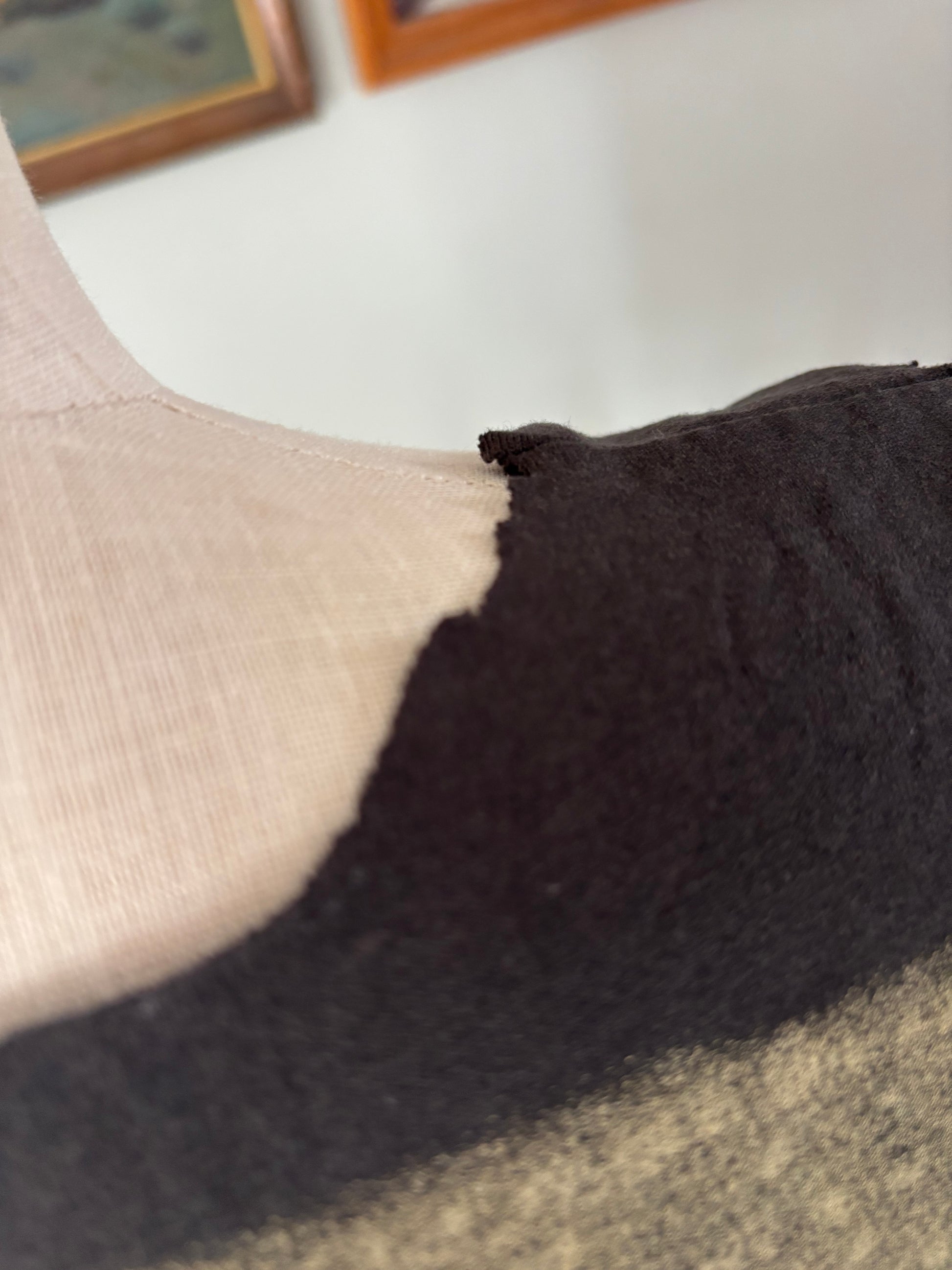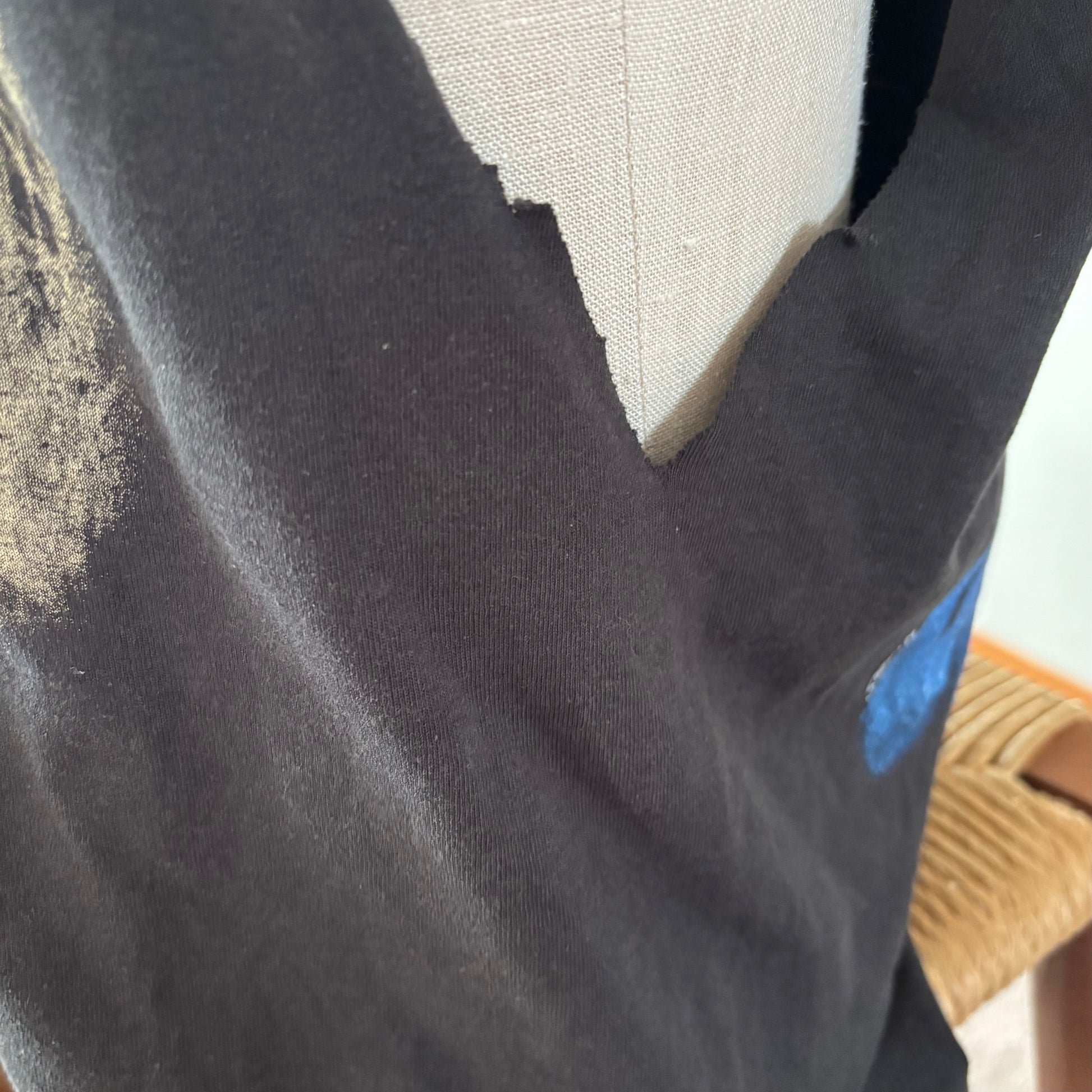 • Raw cut neckline and sleeves (intentional cut)