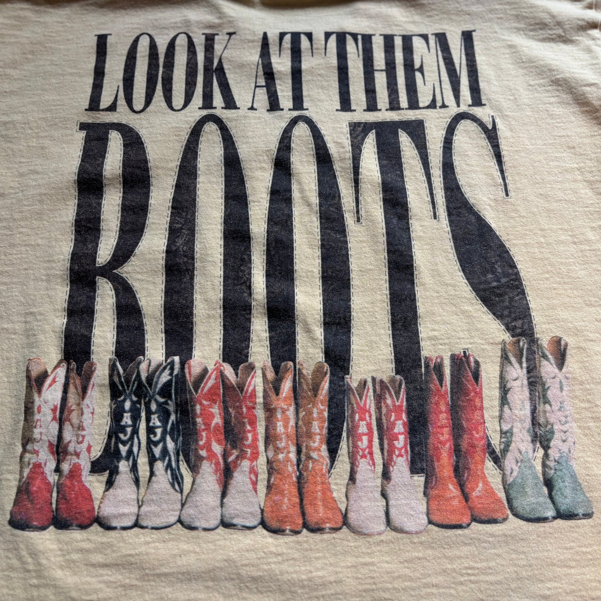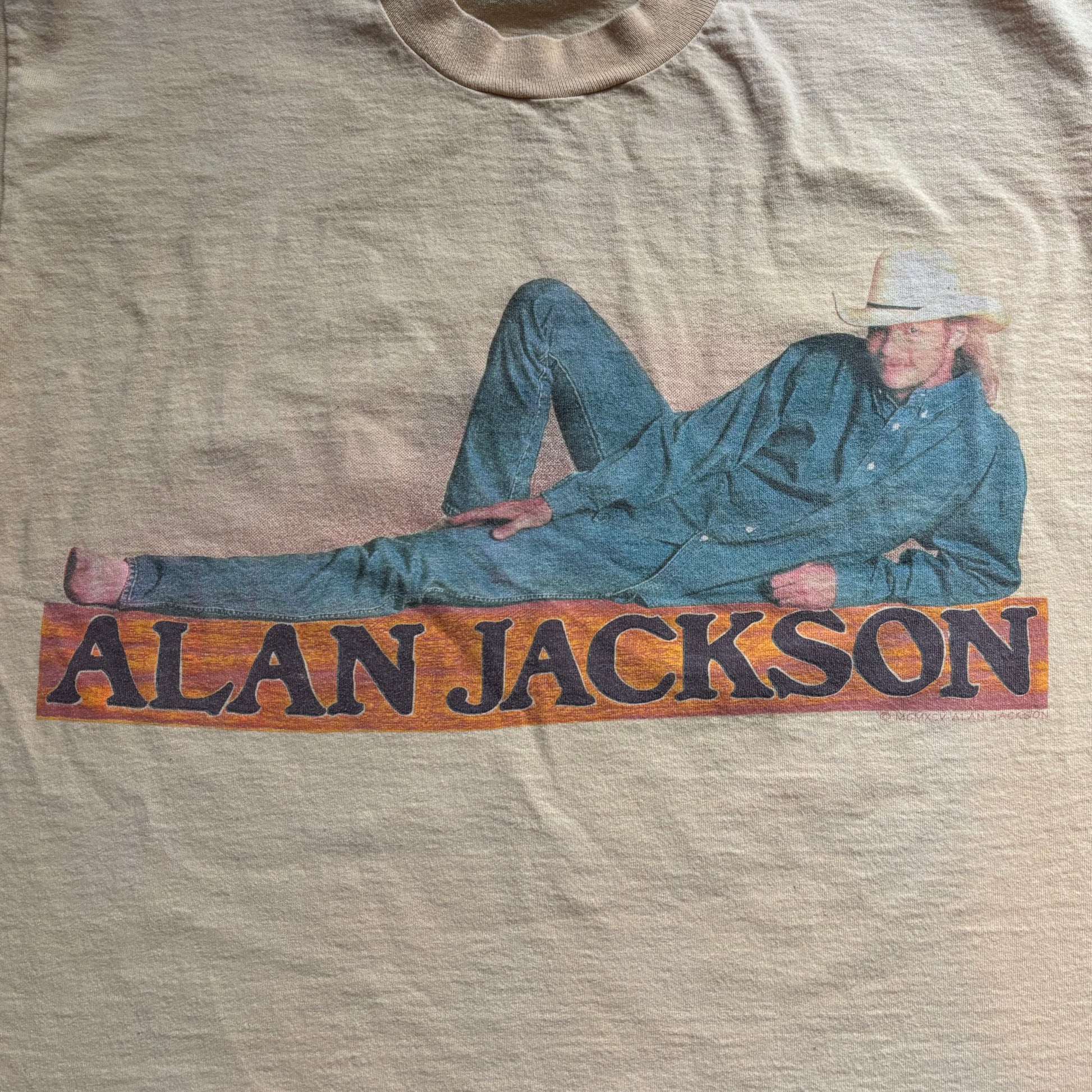 This original 1995 Alan Jackson tee features a front graphic of Alan in classic denim and cowboy hat, with an incredible oversized back hit that reads “LOOK AT THEM BOOTS” above a lineup of colorful western boots.