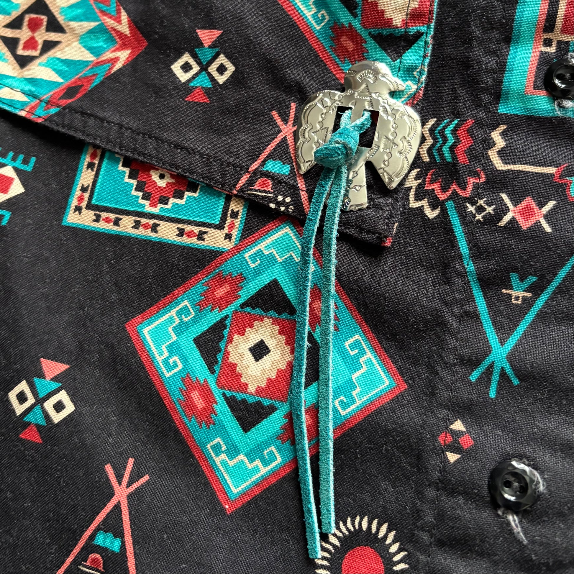 This vintage western layered-in button up shirt features a bold all-over Aztec/Navajo geometric print in vibrant turquoise and red against a deep black background. The standout detail is the built-in bolo tie accent with a silver thunderbird slide and turquoise-tone cord — giving this piece major 90s western revival energy.