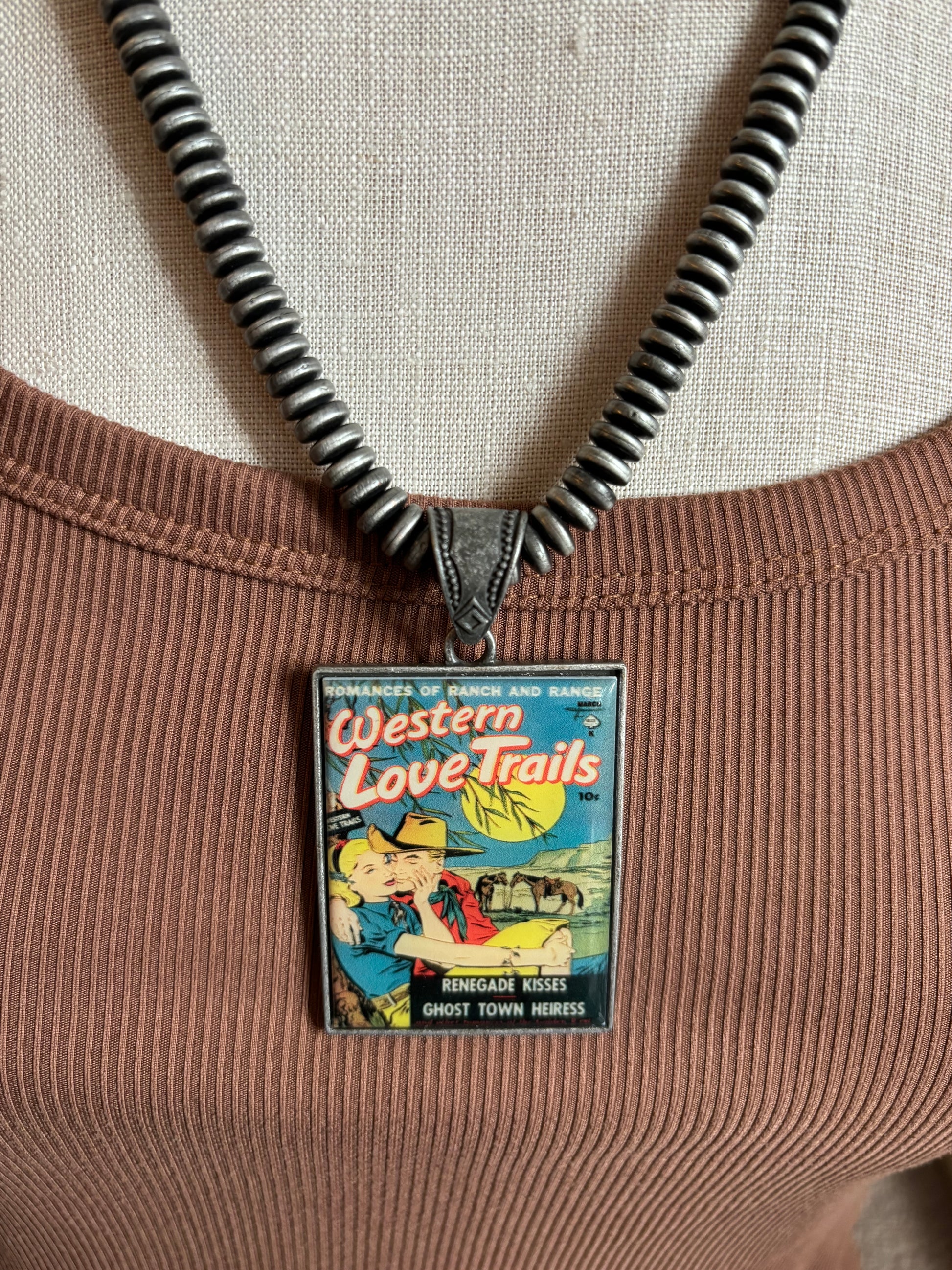This necklace features large oxidized silver-toned saucer beads with a bold, Western-inspired design. At the center hangs a rectangular pendant with a vintage comic-style image titled “Western Love Trails,” showcasing a cowboy and cowgirl in a classic Western romance scene. The pendant is attached with a detailed silver-toned bail that adds extra character and complements the rustic, old-West vibe. It’s a fun statement piece that mixes nostalgia with Western charm.